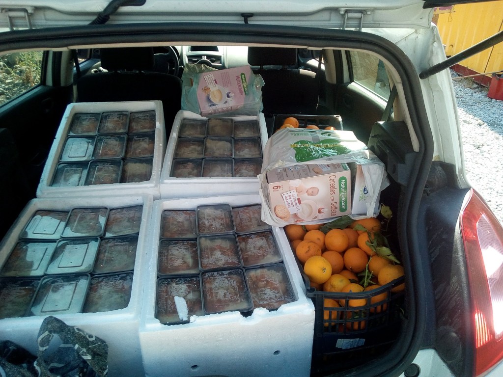 L´ELIANAVOL, asociación de L´Eliana que todo el año no para de prestar su ayuda a todo el que lo necesita y de muy diversas maneras. Enseguida nos lo pusieron todo mucho más fácil. Consiguieron el espacio, alquilaron una furgoneta para el reparto, con sus contactos nos llenaron de tuppers y neveras para el transporte de la comida caliente y con diversos comerciantes de allí conseguimos surtirnos de carne, frutas, pan, envases adecuados y mas necesidades para cocinar a precio de costo.