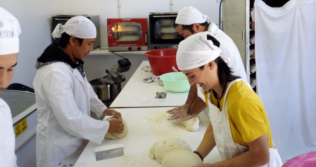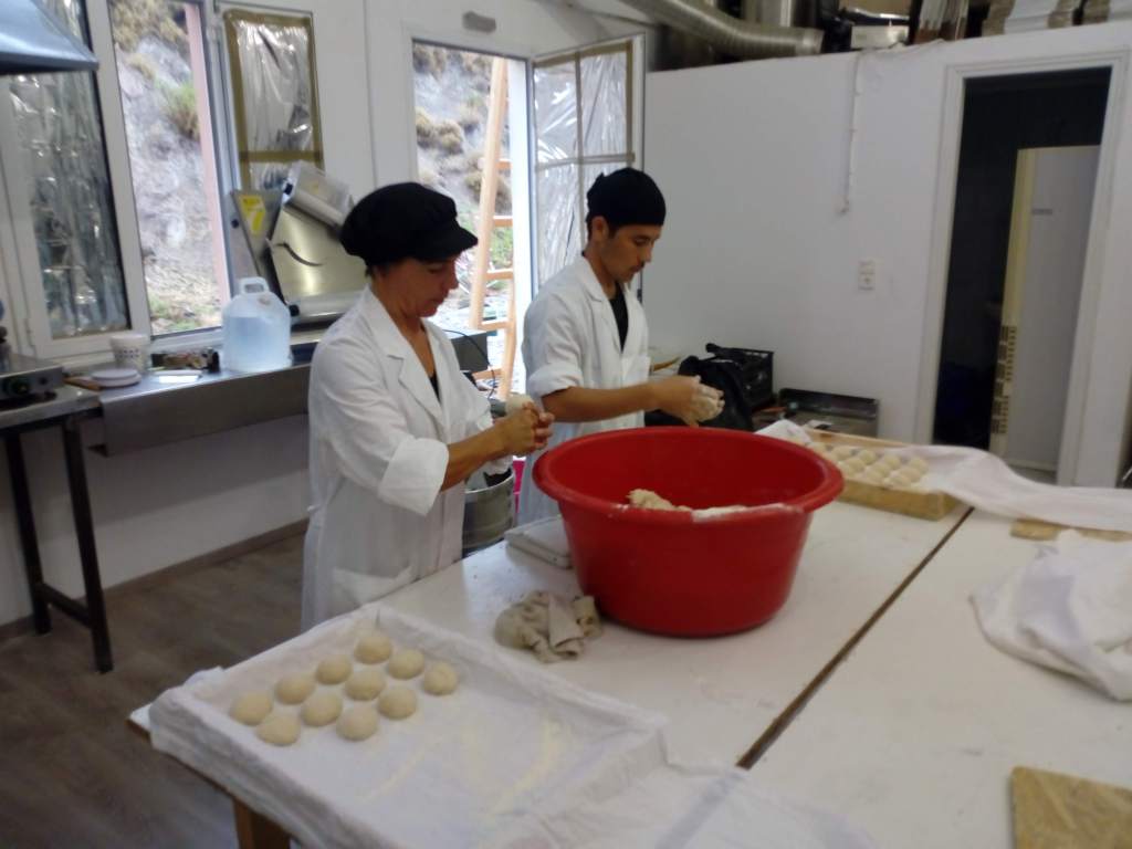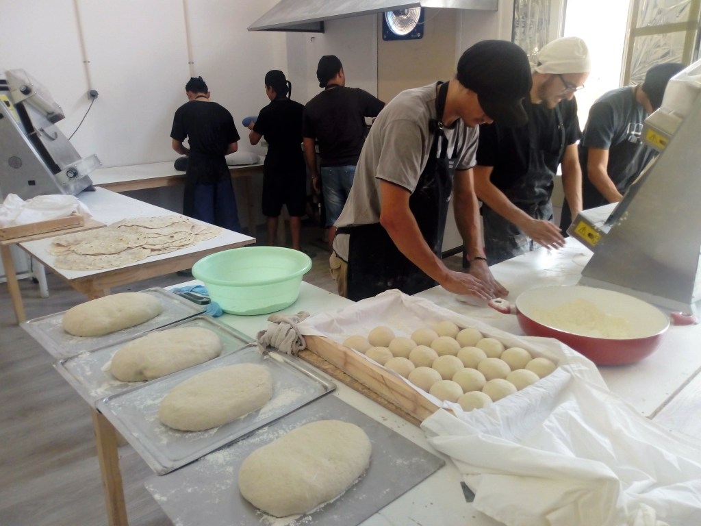 Durante su actuación tanto en Polikastro como en Lesvos contamos con un equipo de hasta 6 refugiados ,con los que conseguimos formar una pequeña cooperativa que les reportaba un salario de unos 500 € mensuales a cada uno de ellos. Buscamos clientes en otras asociaciones que distribuían comida gratuitamente en los campamentos y compraban el pan industrial para sus repartos , con lo que cerramos el circulo y además de que el pan fuera gratuito para los refugiados en los campos , formamos y dimos trabajo a estas personas refugiadas