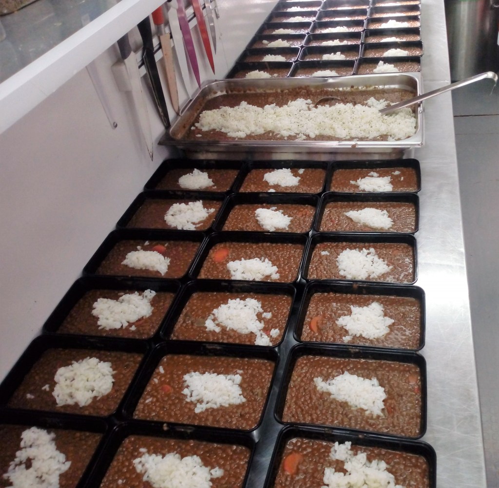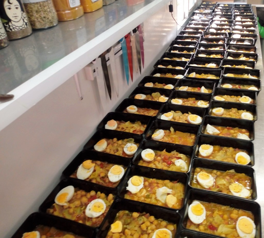Empezamos a cocinar la primera semana, las cifras al terminar el empaquetado de las raciones eran cuanto menos llamativas, 1200 raciones en los primeros días que se llevaban a puntos de distribución improvisados en la zona cero escoltados por la policía municipal de L´Eliana, porque los atascos y el caos para llegar hasta ellos eran harto dificultoso.(a veces hasta 4 horas para poder completar el reparto)