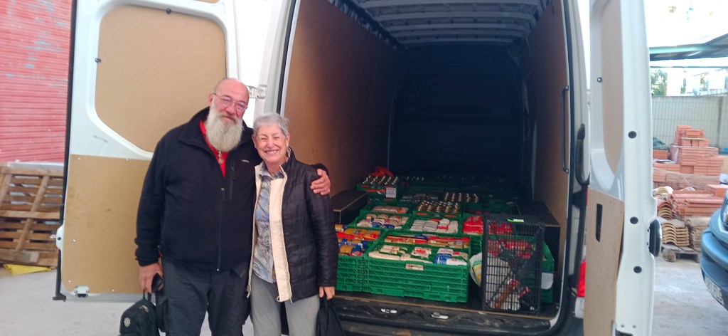 No contentos con eso y siempre gracias a Cova hicimos un nuevo contacto para recibir donaciones de alimentos no perecederos,(nos puso el listón mas alto) Se consiguieron 10 tráiler mas de alimentos no perecederos con portes gratis hasta Valencia , nos quedamos nosotros con 3 de ellos, cedimos 5 a G.B.G.E. y 2 mas los llevamos al almacén de SOS refugiados Europa donde seguían a nuestra disposición 6 palets más de conservas de legumbres .